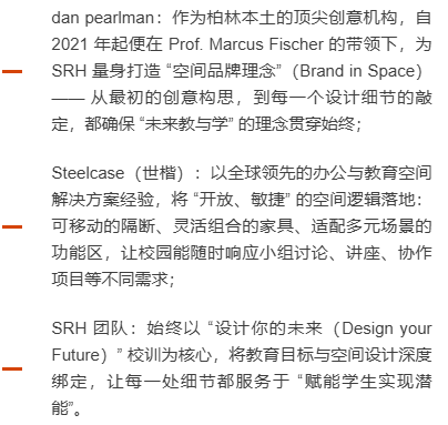 正如 SRH 大学校长 Dr Thorsten Bagschik 所说:“这座校区远不止是学习场所 —— 它是学生主动塑造未来的平台。建筑、设计与品牌在这里融合了功能性与灵感,让‘创新教育’不再是口号,而是能触摸、能体验的日常。”