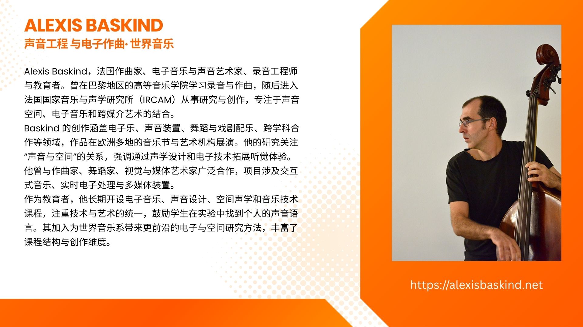 Alexis Baskind 教授则来自欧洲当代音乐与研究前沿,曾在法国国家音乐与声学研究所(IRCAM)从事创作与研究,专注于电子音乐、空间声学与跨媒介艺术。他的作品跨越作曲、空间设计与声音工程,为音乐教育注入了实验性与方法论的维度。
