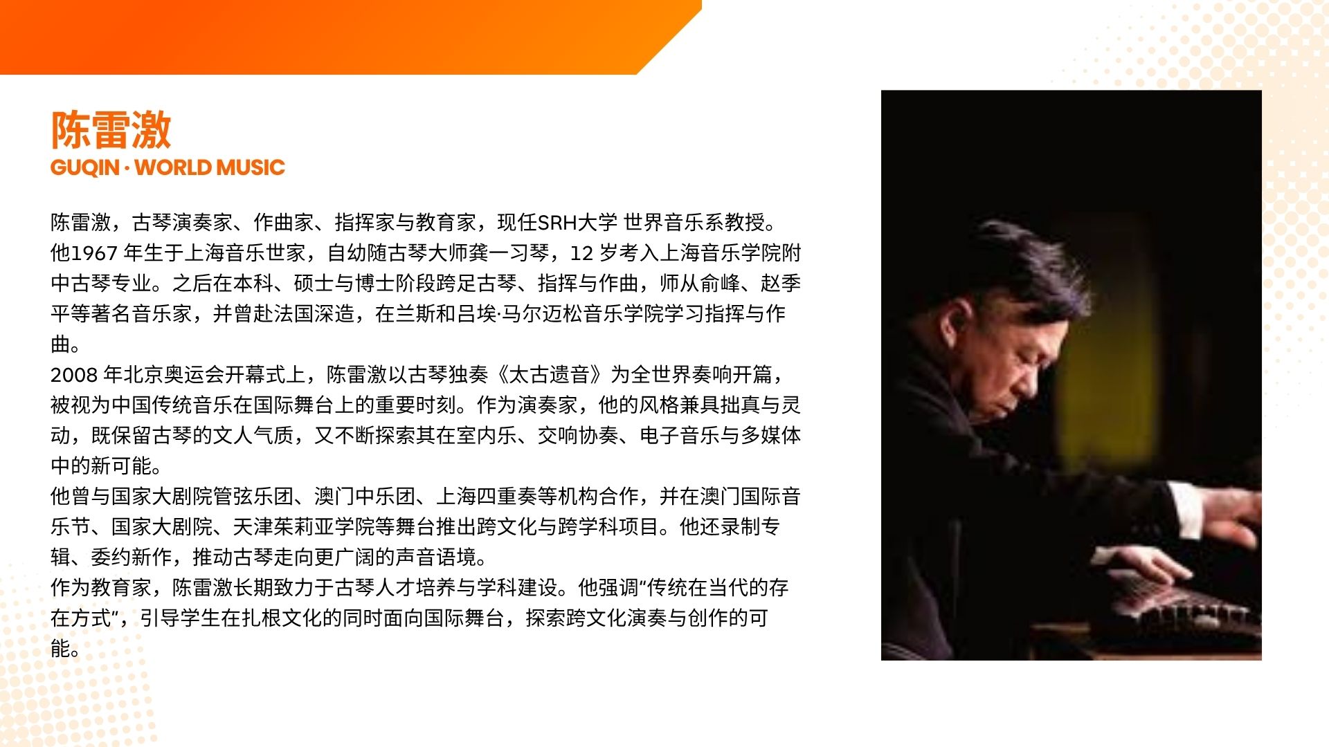 陈雷激教授以古琴之声登上 2008 北京奥运会开幕式舞台,长期活跃于国际音乐节与跨文化合作。他的演奏与创作,让古琴在保持东方神韵的同时,也能够在室内乐、协奏曲、电子与跨界语境中获得新的生命。他的加入,为世界音乐系带来的是一份深厚的传统根基与跨文化的教学经验,让学生在古琴中体会“文人之器”的古意,也在跨界中看见它的当代生命力。